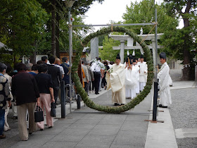正面から最初に左回り、次に右回りと 8 字を描いて計3回くぐることで、半年間に溜まった病と穢れを落とし残りの半年を無事に過ごせることを願うというものである。かつては茅の輪の小さいものを腰につけたり首にかけたとされる。これは、『釈日本紀』逸文の『備後国風土記』にもある蘇民将来の伝説に由来するもので、武塔神の指示により茅の輪を腰につけたところ災厄から免れ、武塔神は自らを速須佐雄と名乗り去っていったと書かれている。外の暑さからひんやり開放~これからの暑い時期には欠かせません!